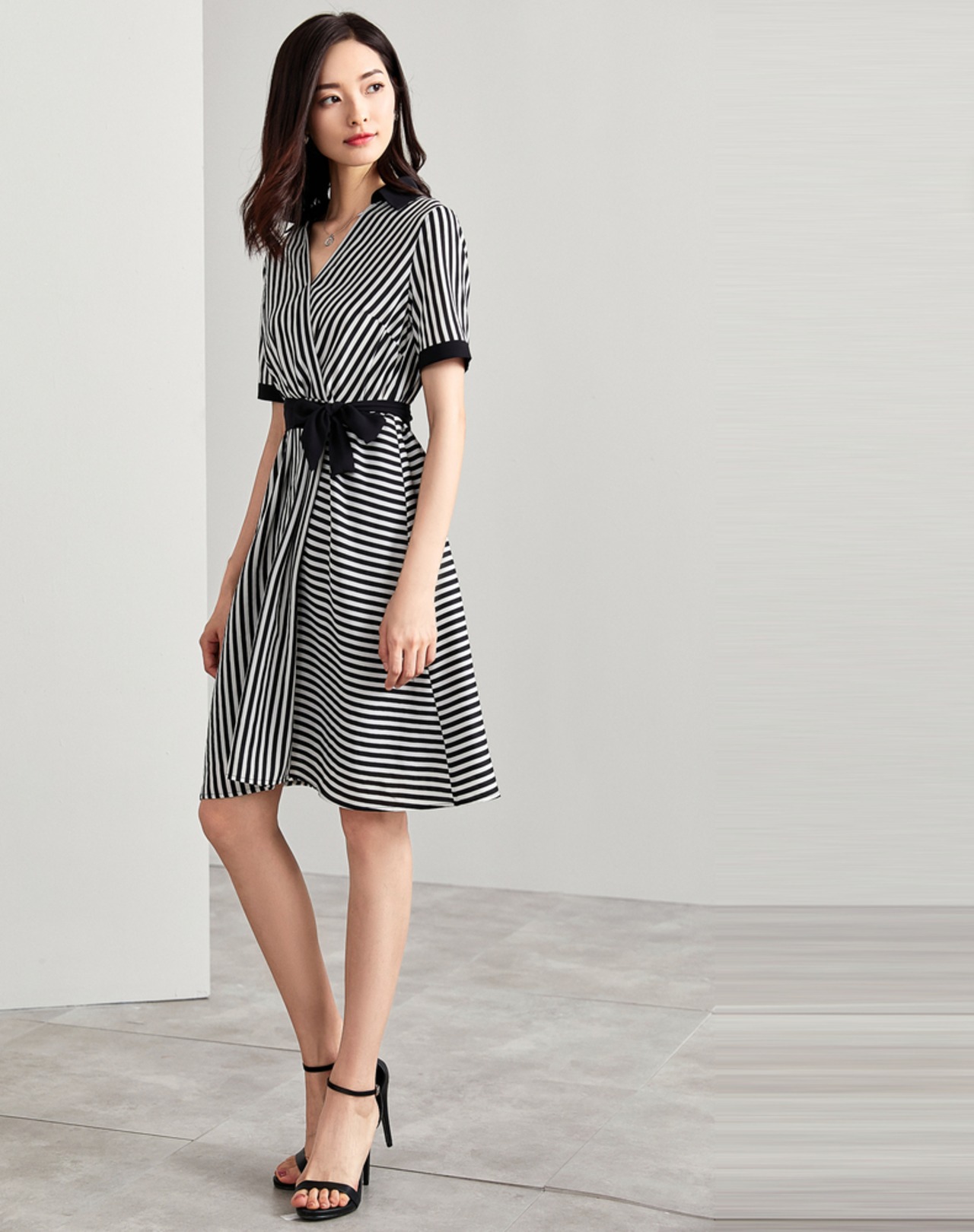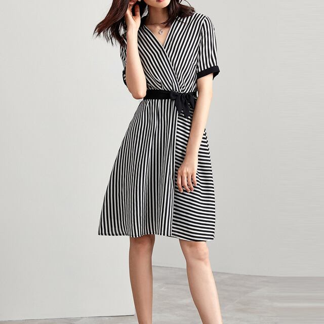 モノトーンのストライプが大人っぽく落ち着いた雰囲気の、膝上丈半袖ワンピースです。