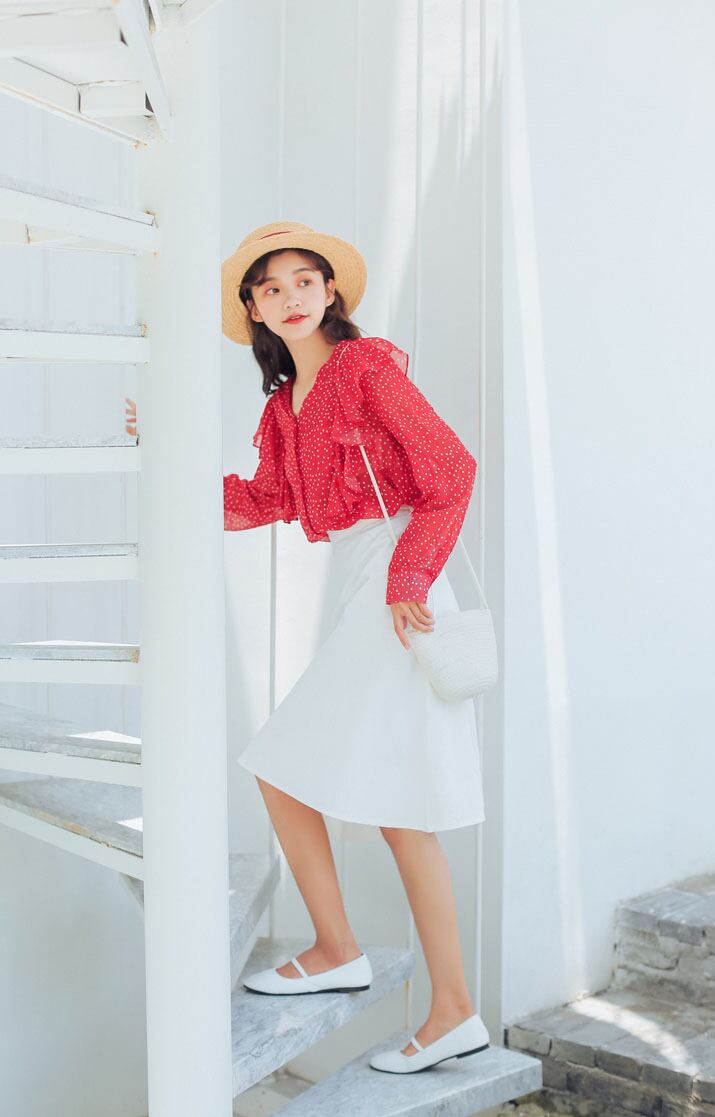 シースルーが大人っぽくも水玉やフリルがかわいらしい雰囲気の、長袖シフォンブラウスです。