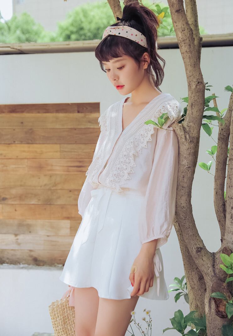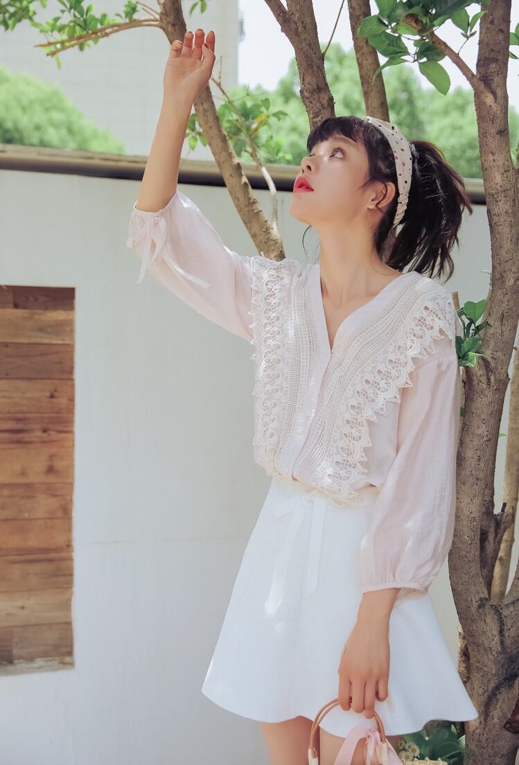 大きなフリルや袖元のリボンが女性らしく可愛らしい、七分袖Vネックブラウスです。