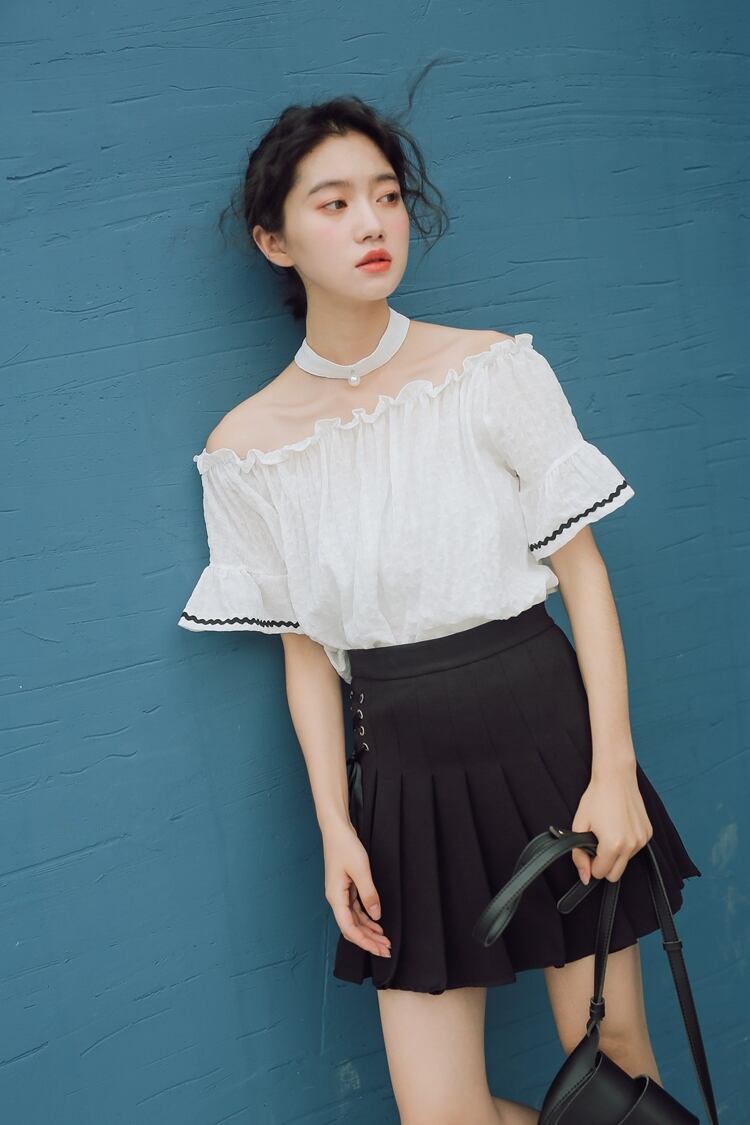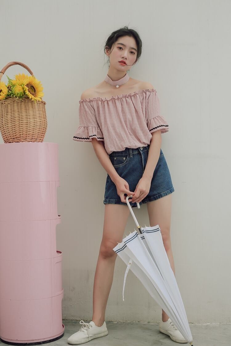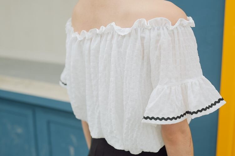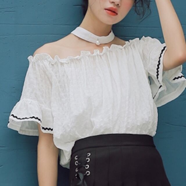 あちらこちらにあしらわれたフリルやギャザーが女性らしく、とても可愛らしい雰囲気のトップス。