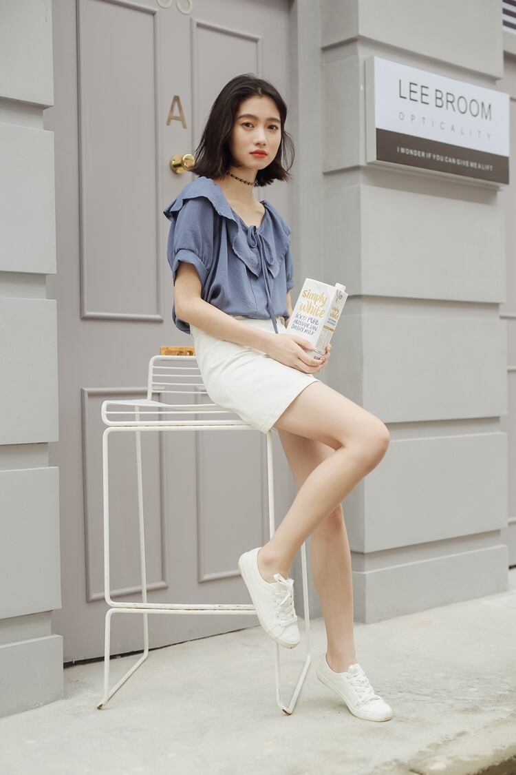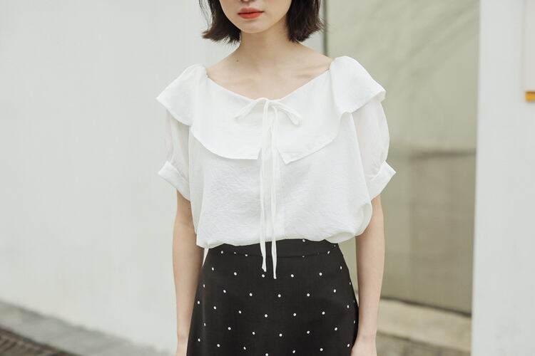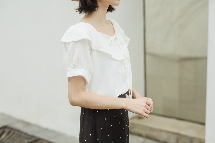 ネックラインにあしらった大き目フリルが大人可愛いブラウスです♪