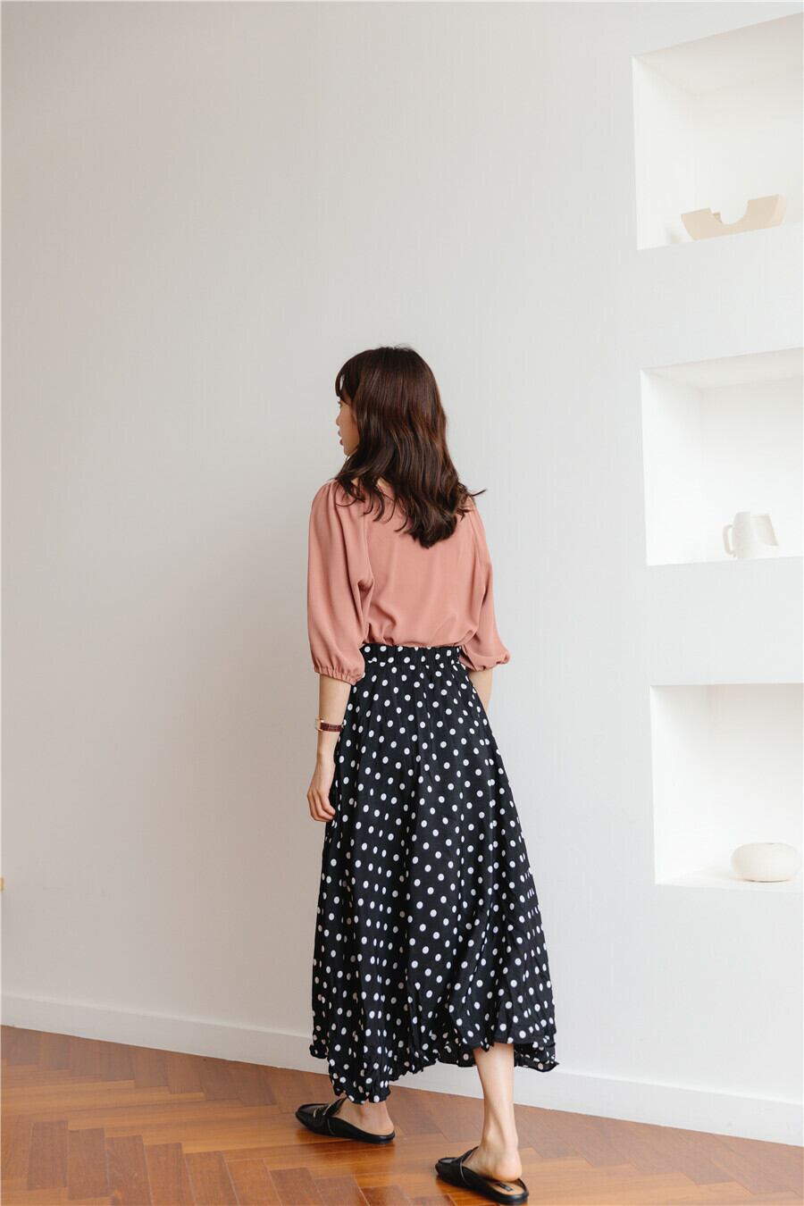広がりすぎないAラインとハイウエストのコンビがほっそりとしたスタイルに!