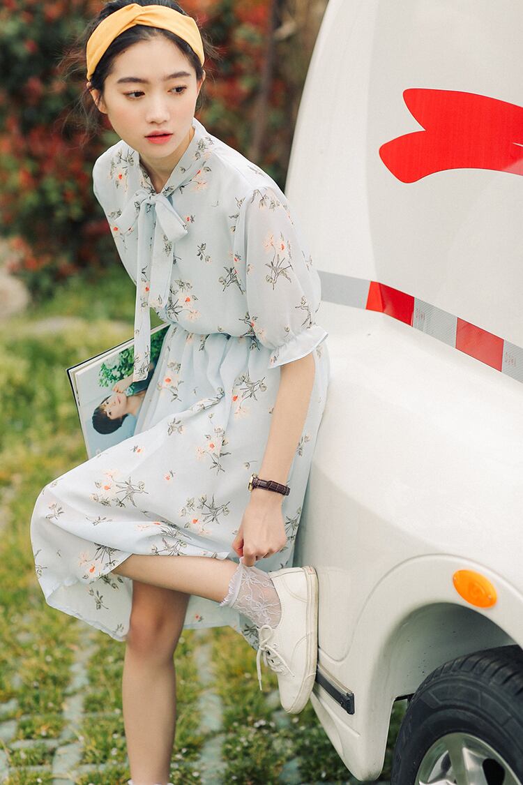 胸元のリボンとふんわりとしたシルエットが女の子らしい花柄ワンピース☆