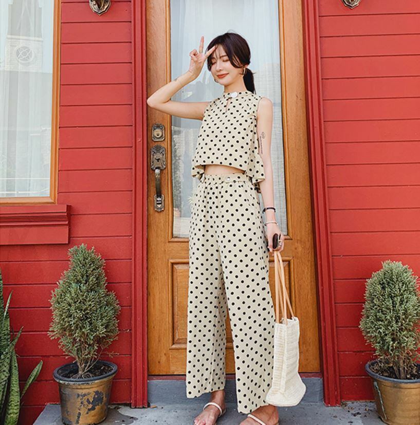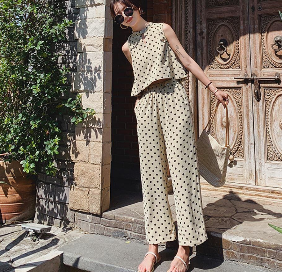 ドット柄が可愛いハイウエストパンツとノースリーブのセットアップ☆