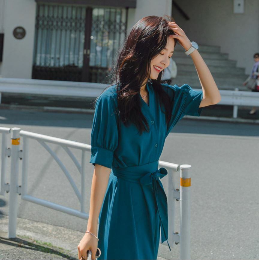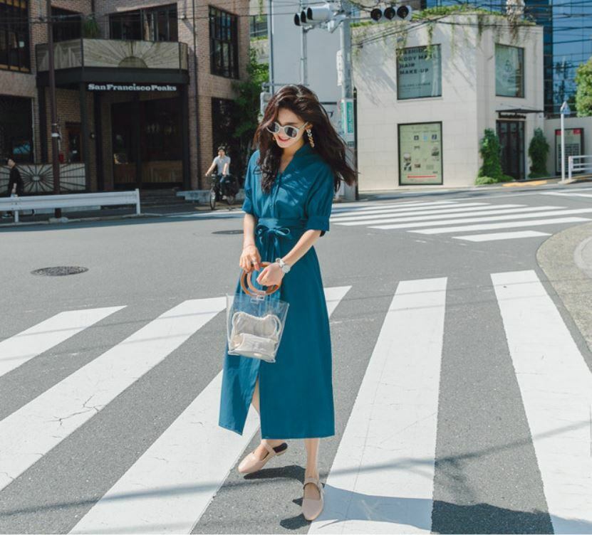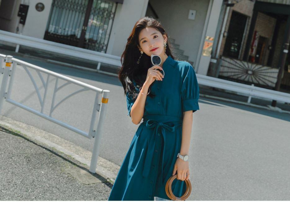 鮮やかなターコイズブルーが目を引く大人きれいなシャツワンピース♪