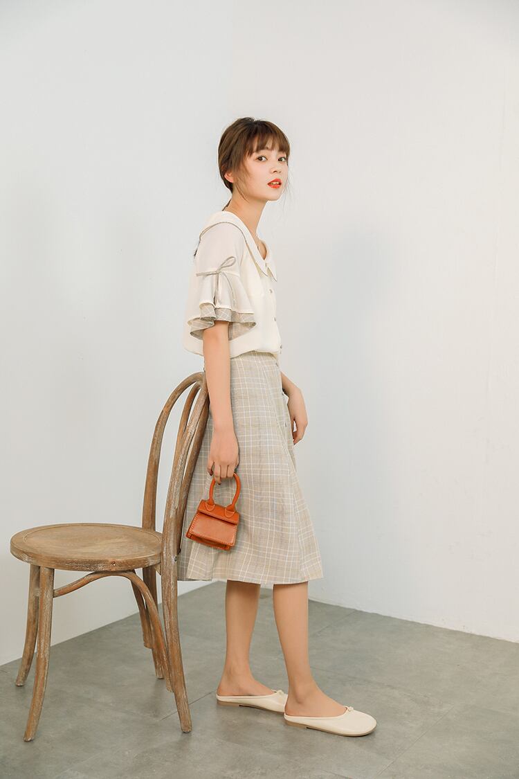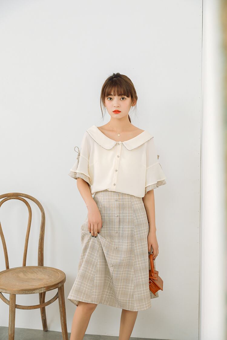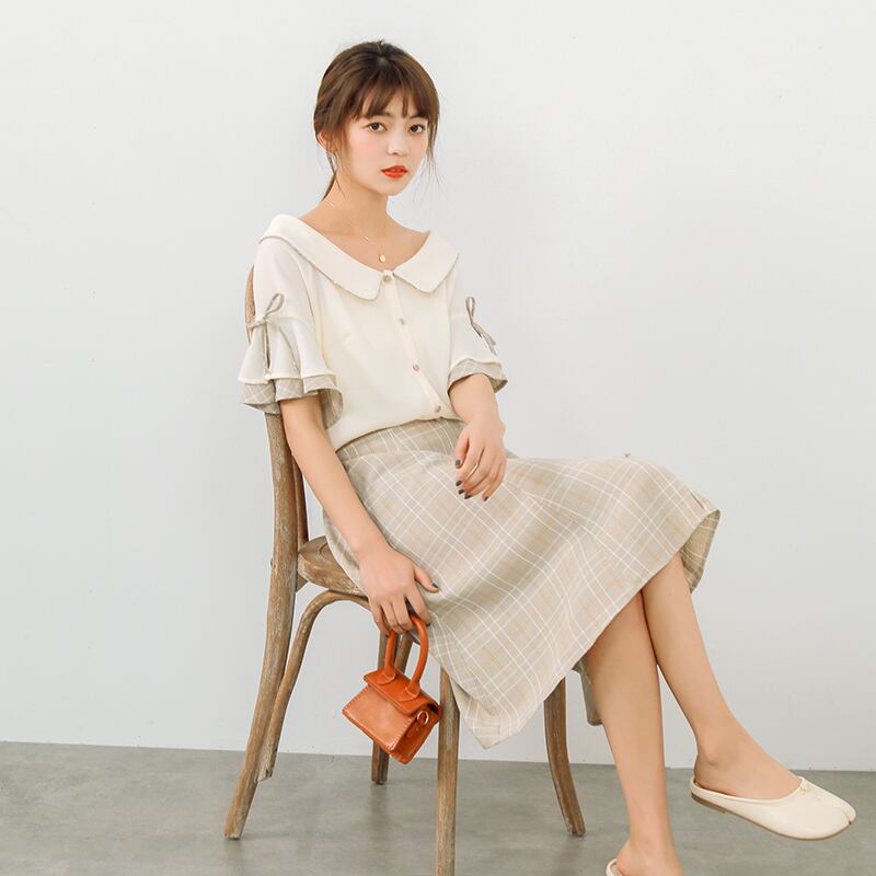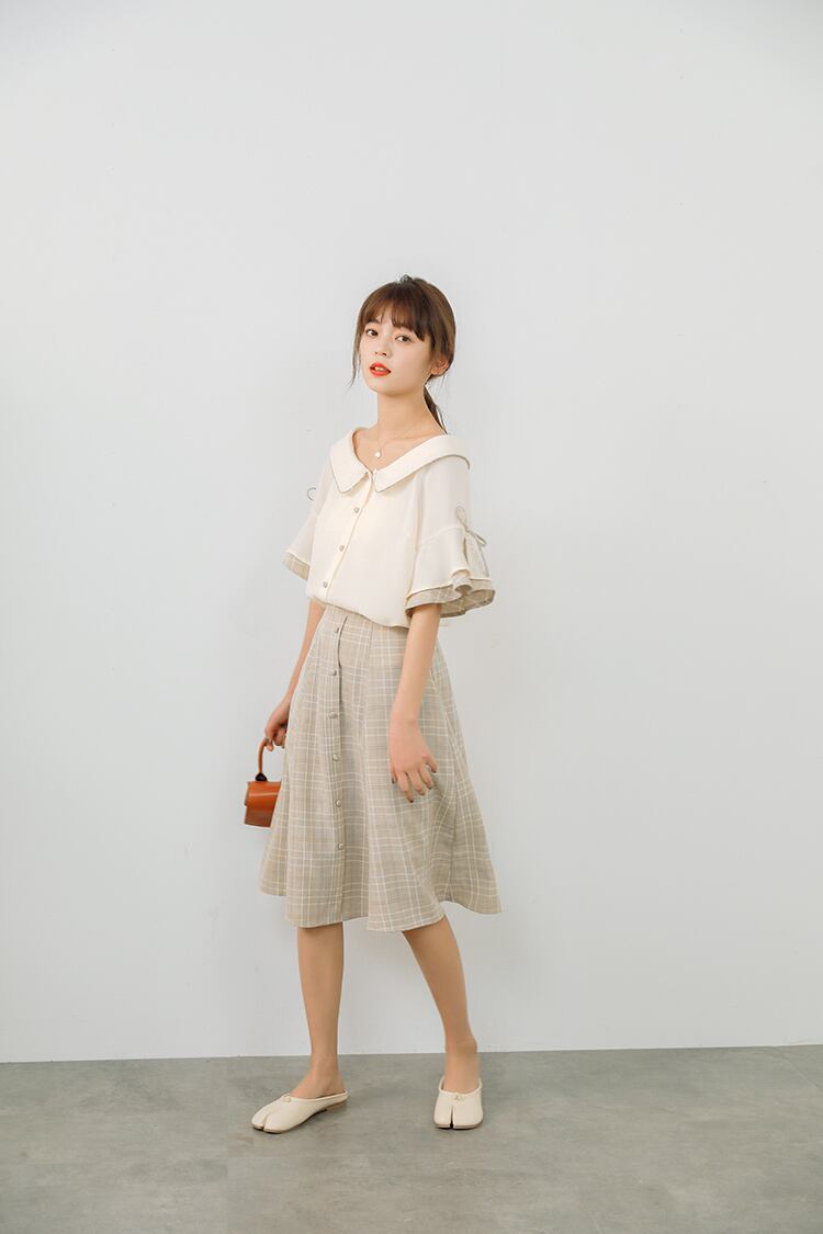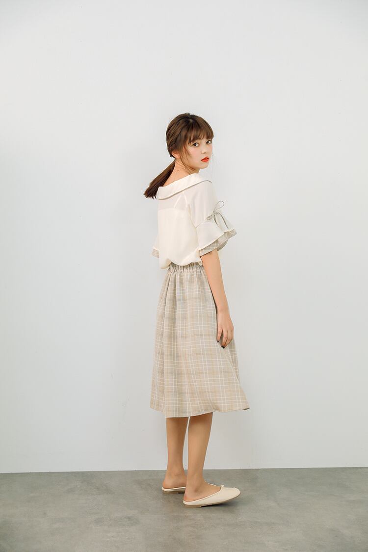新作 人気 トレンド 夏 セットアップ 2点セット 無地 チェック ブラウス ベルスリーブ 五分袖 スカート フレア 膝丈 前ボタン レトロ ガーリー KN-1118 | dress_sugar_moon