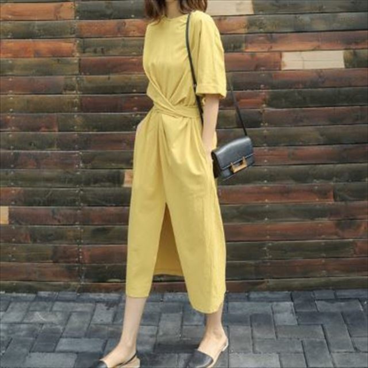 くすんだイエローがトレンドのミモレ丈ワンピースです。
