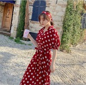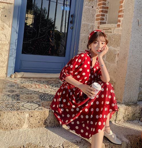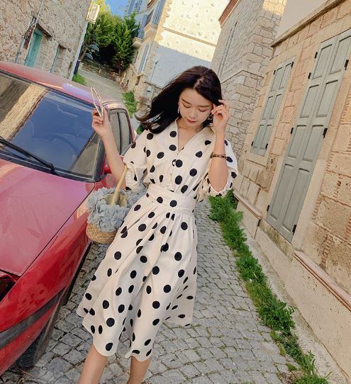 トレンドの大きめドット柄がかわいい膝丈ワンピースです。