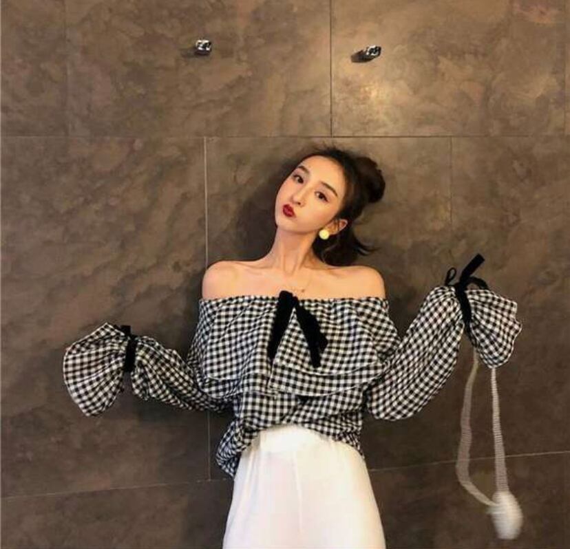 春 夏 新作 アイテム ギンガムチェック シャツ レディース 大人 かわいい ラッフルブラウス オフショルダー 肩出し セクシー リボン カジュアル 袖コン ベルスリーブ トレンド 3カラー 赤 黒 ベージュ YN-5-36 | dress_sugar_moon