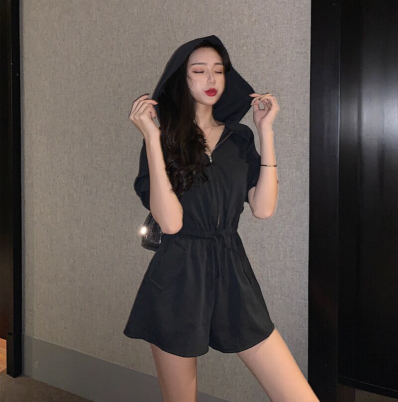 春 夏 レディース オールインワン サロペット 2色 ショートパンツ フード付き 半袖 七分丈 ハイウエスト 無地 おしゃれ シンプル カジュアル SY-5-106 | dress_sugar_moon