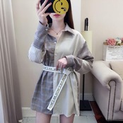 春 夏 秋 レディース トップス シャツ ブラウス 大きいサイズ 2トーン ボーダー ストライプ チェック 格子 ウエストベルト 長袖 カジュアル 原宿系 おしゃれ トレンド かわいい YN-5-59 | dress_sugar_moon