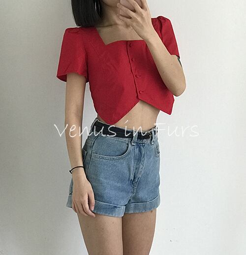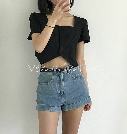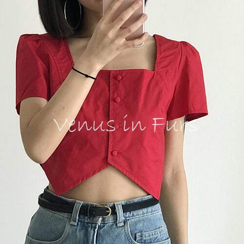 春 夏 レディース トップス シャツブラウス オフィス スクエアネック へそ出し トップス 韓国 3色 半袖 ショート丈 無地 シンプル 普段使い デート 女子会 かわいい おしゃれ SY-5-139 | dress_sugar_moon