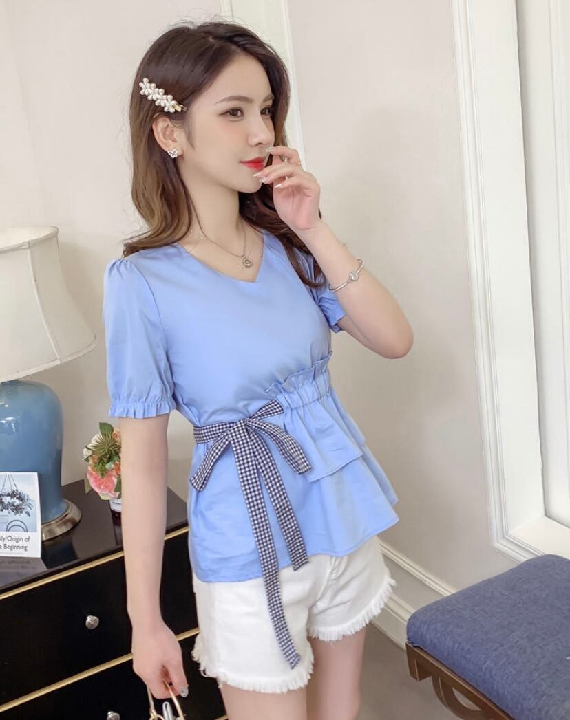 春 夏 レディース トップス シャツ カットソー 大きいサイズ Vネック 半袖 ウエストリボン フリル 体型カバー 上品 清楚 シンプル チェック オフィス 通勤 通学 YN-5-67 | dress_sugar_moon