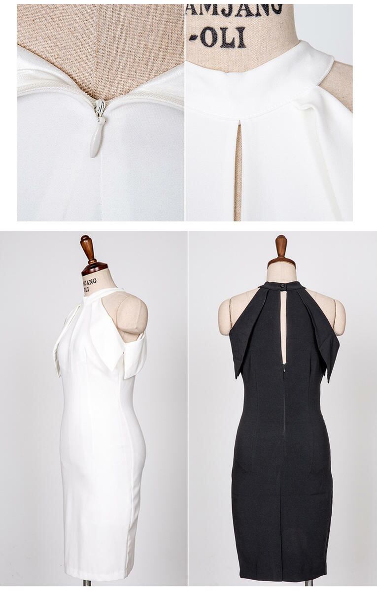 パーティードレス オフショル ホルターネック OL 膝丈 スリム スリット セクシー 大人 2カラー 白 黒 パーティー 結婚式 二次会 披露宴 お呼ばれ キャバドレス YN-5-72 | dress_sugar_moon