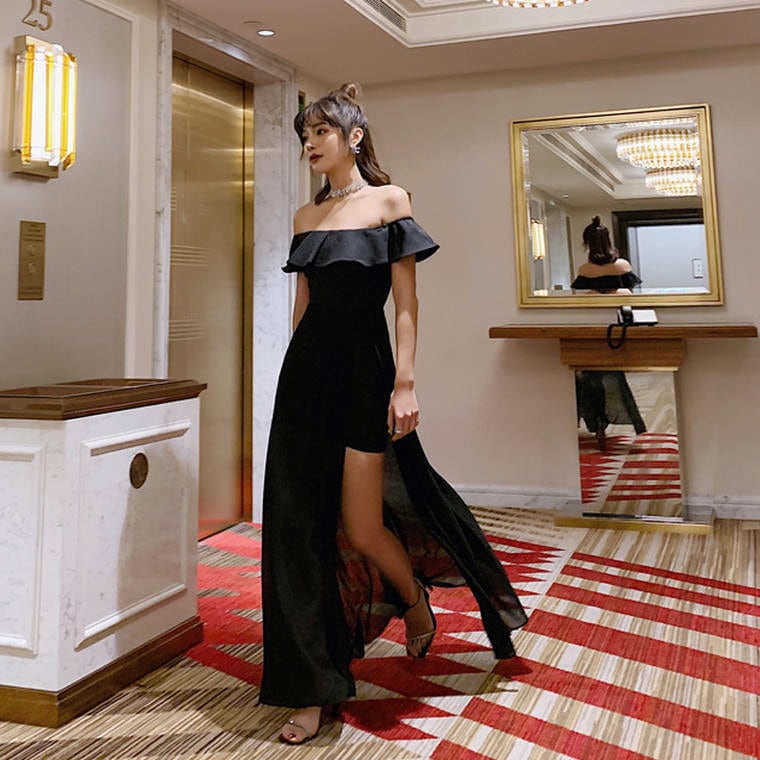 大きいサイズ パーティードレス ロング丈 レディース オフショルダー スリット セクシー 大人 ハイウエスト 結婚式 二次会 披露宴 パーティー お呼ばれ キャバドレス YN-5-75 | dress_sugar_moon
