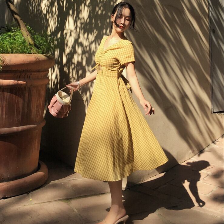 春 夏 レディース ワンピース 大きサイズ レトロワンピース 60年代 半袖 ロング丈 ロングワンピース 背中リボン チェック柄 リゾート 海 プール かわいい おしゃれ 韓国 きれいめ プチプラ FA-1150 | dress_sugar_moon