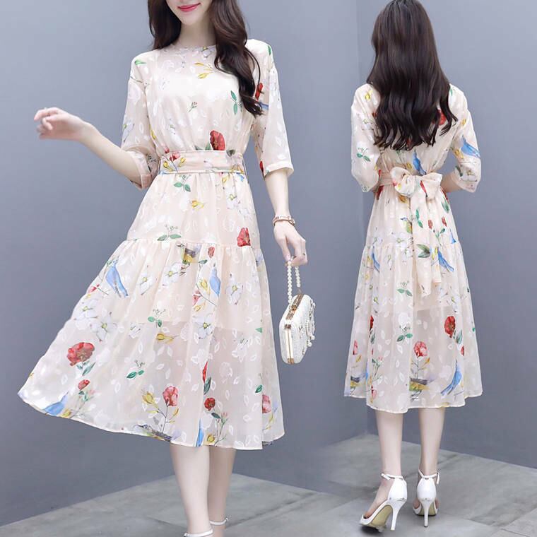 春 夏 レディース ワンピース 花柄 ワンカラー 大きいサイズ シャツワンピース ハイウエスト バックリボン ウエスト スリム ラウンドネック 5分袖 上品 清楚 おしゃれ デート おでかけ YN-5-112 | dress_sugar_moon