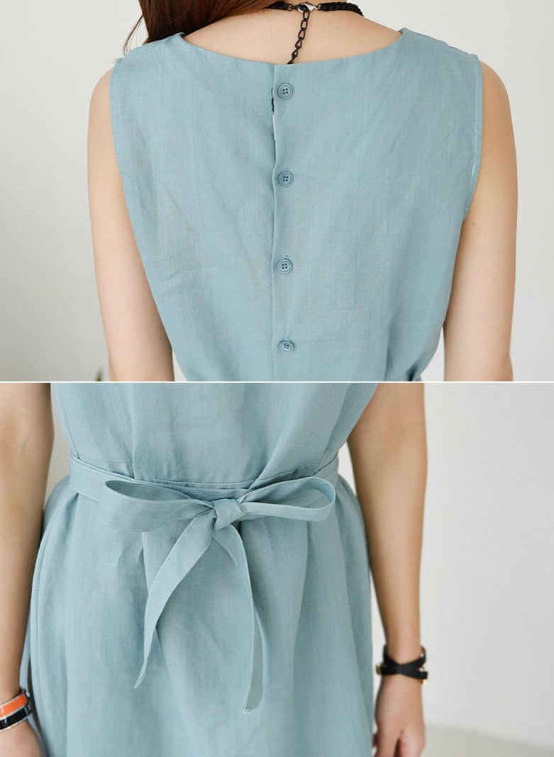 春 夏 レディース ワンピース 大きいサイズ ミドル丈 シャツワンピ ウエストリボン ノースリーブ バックボタン バックコンシャス ワンカラー レイクブルー おでかけ デート 体型カバー YN-5-114 | dress_sugar_moon