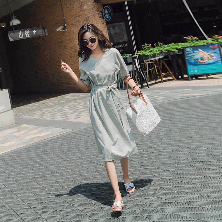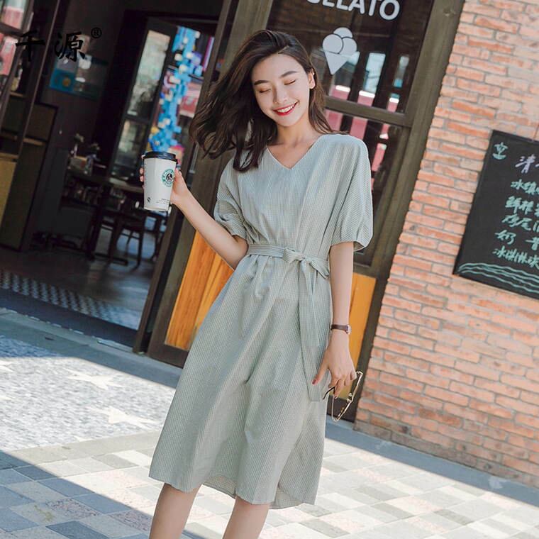 春 夏 レディース ワンピース ワンカラー 韓国 ミドル丈 Vネック ウエストリボン 体型カバー バックボタン バックコンシャス 半袖 緑 チェック 格子 おしゃカジュアル 可愛い さわやか YN-5-118 | dress_sugar_moon