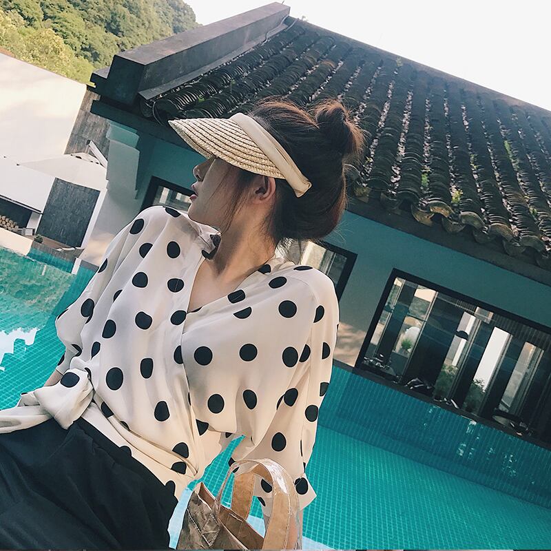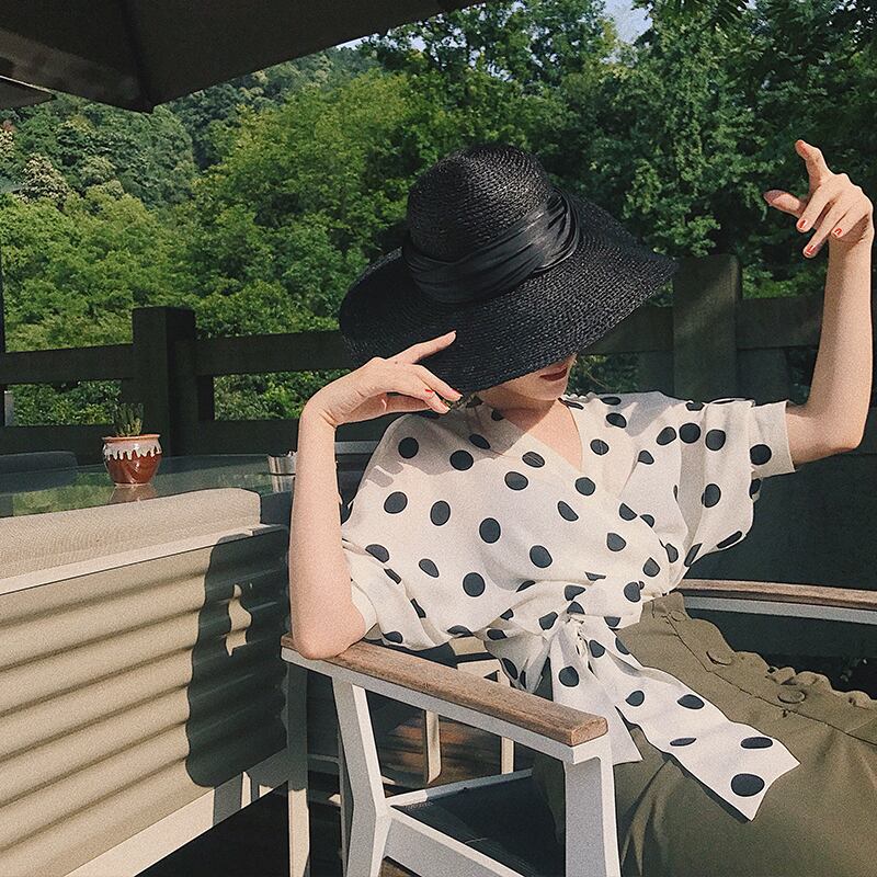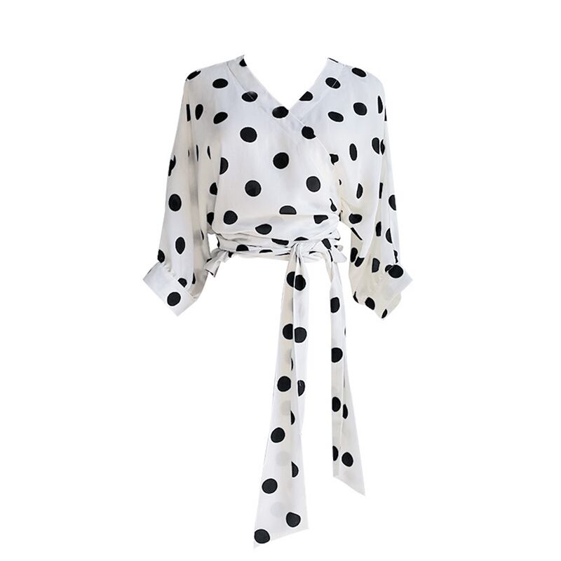 春 夏 レディース シャツブラウス かわいい トップス オフィス 変速トップス Vネック 半袖 ドット柄 水玉模様 レトロ リボン リゾート 海 プール かわいい おしゃれ 韓国 きれいめ プチプラ FA-1206 | dress_sugar_moon
