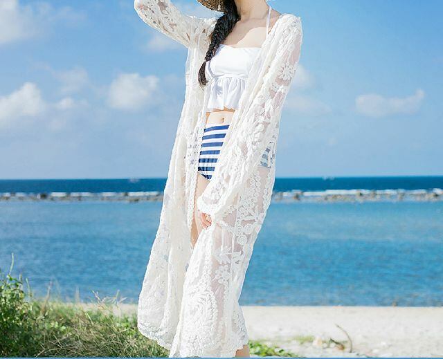 春 夏 レディース カーディガン ホワイト ショールコート ロング丈 ストライプ 冷房対策 薄手 長袖 羽織り デート リゾート 海 プール かわいい おしゃれ 韓国 きれいめ プチプラ KR-5-147 | dress_sugar_moon