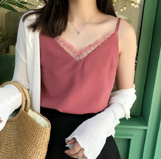 春 夏 レディース タンクトップ キャミソール ノースリーブ 大きいサイズ シフォン Vネック レース デート リゾート 海 プール かわいい おしゃれ 韓国 きれいめ プチプラ KR-5-167 | dress_sugar_moon