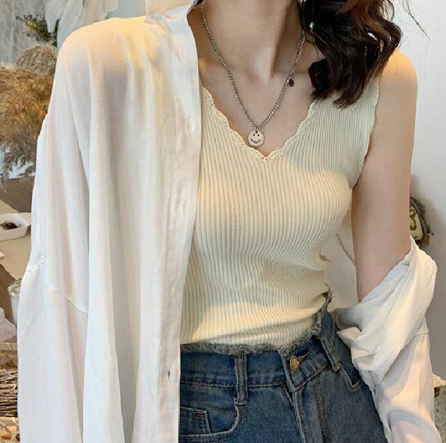 春 夏 レディース タンクトップ キャミソール ノースリーブ 大きいサイズ Vネック ニット ストライプ デート リゾート 海 プール かわいい おしゃれ 韓国 きれいめ プチプラ KR-5-169 | dress_sugar_moon