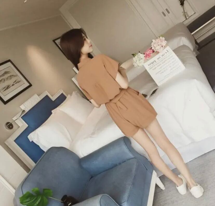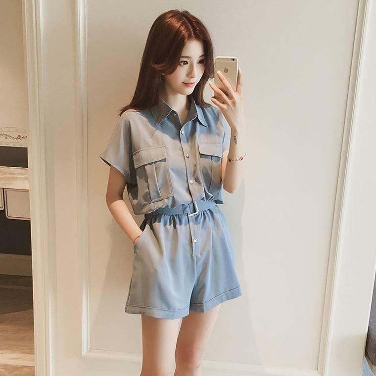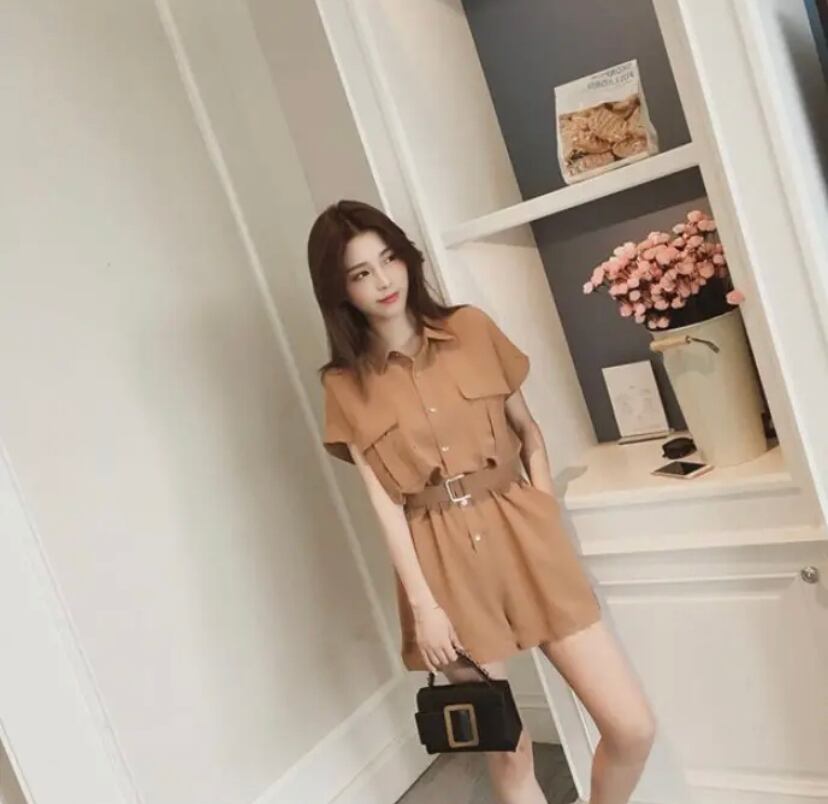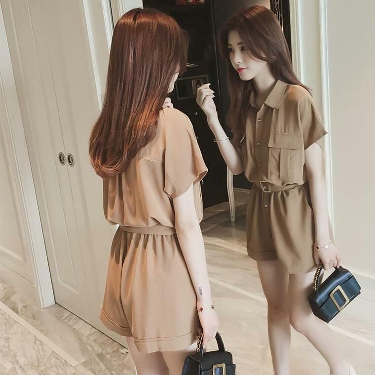 春 夏 レディース オールインワン シャツ 半袖 ウエストベルト 大きいサイズ 2カラー 茶 灰 簡単コーデ おしゃれ 可愛い スリム デート お出かけ YN-6-10 | dress_sugar_moon