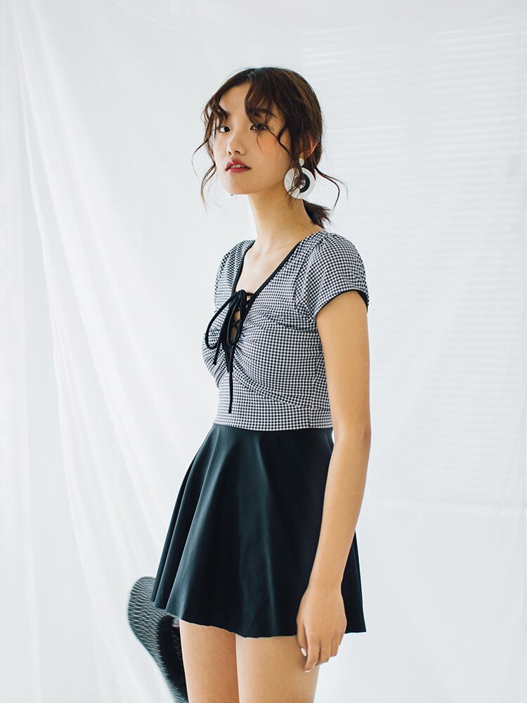 春 夏 レディース 水着 半袖 ワンピース スカート Aライン チェック柄 リボン バイカラー ツートン 水着 ワンピース ワンピース水着 黒 ブラック リゾート 海 プール おしゃれ かわいい 韓国 きれいめ プチプラ SY-6-46 | dress_sugar_moon