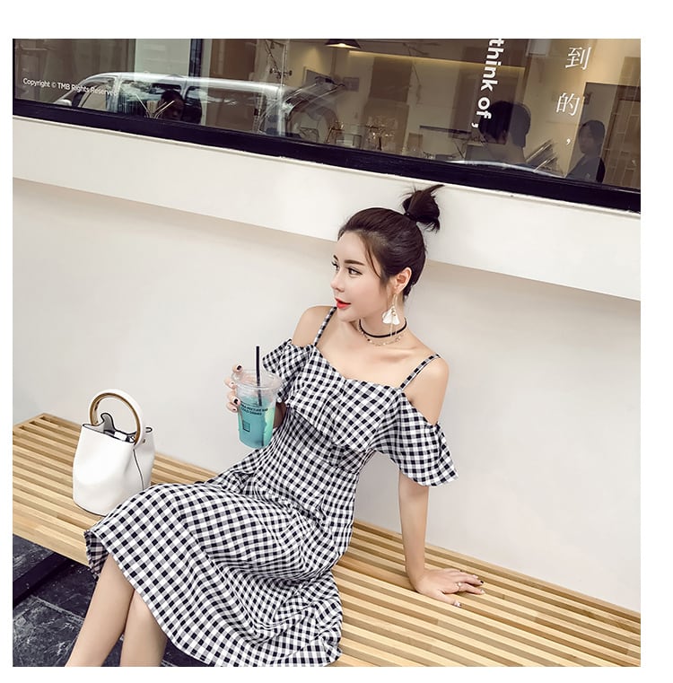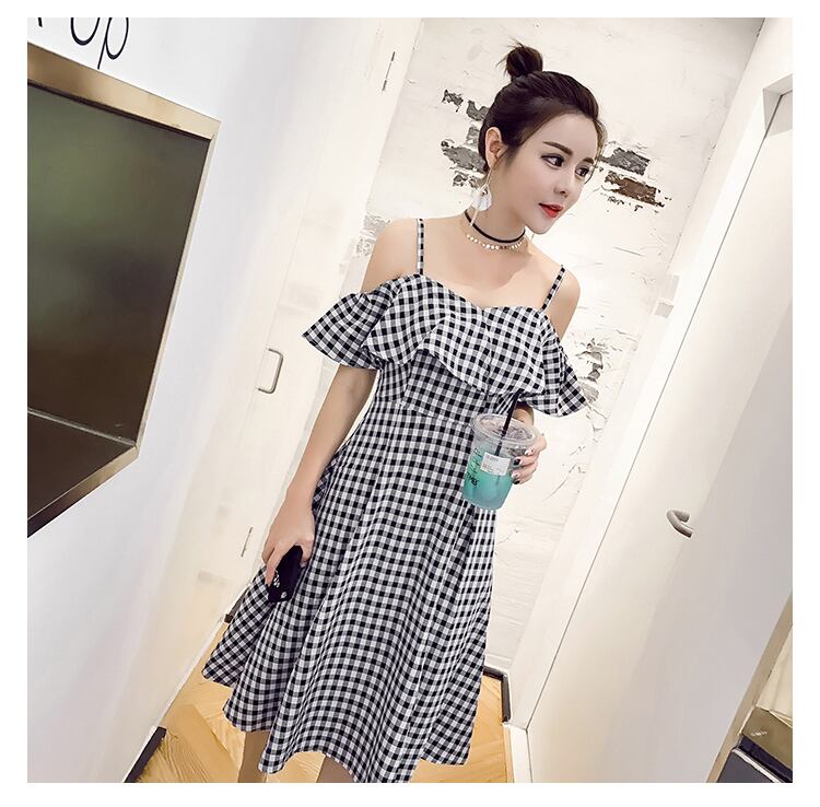 春 夏 レディース ワンピース 大きいサイズ 肩見せ オフショル シャツ ブラック 黒 チェック柄 ワンピース ロング丈 ロングワンピース リゾート 海 プール おしゃれ かわいい 韓国 きれいめ プチプラ SY-6-60 | dress_sugar_moon