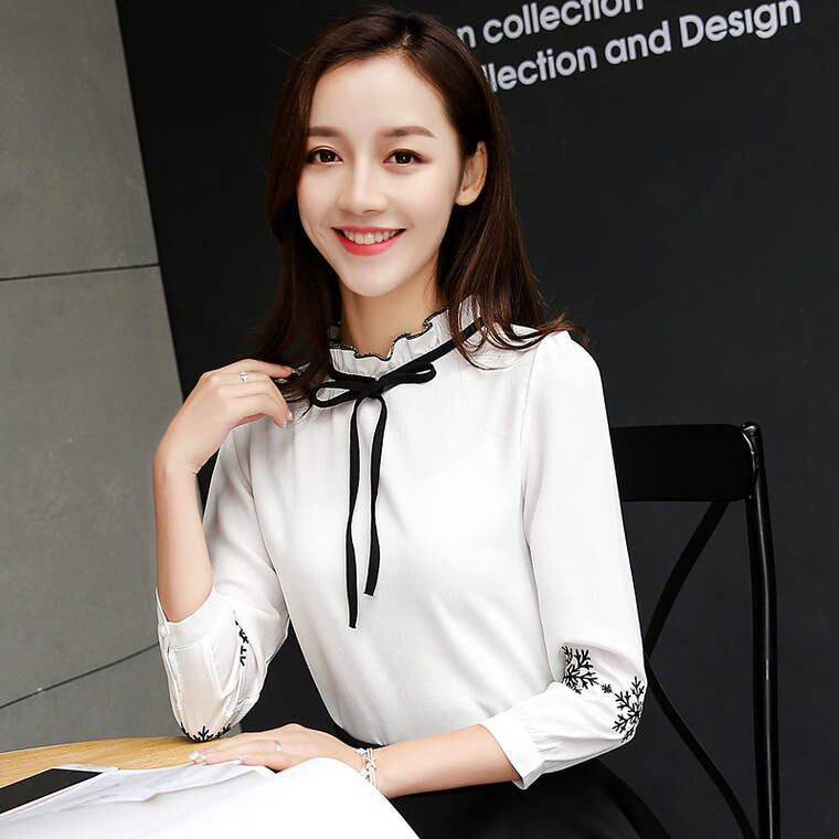 春 夏 レディース シャツ ブラウス 大きいサイズ 雪の結晶 リボンタイ ボウタイ フリル襟 7部袖 長袖 シンプル おしゃれ 上品 清楚 オフィス OL YN-6-34 | dress_sugar_moon