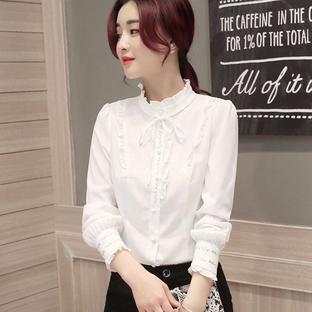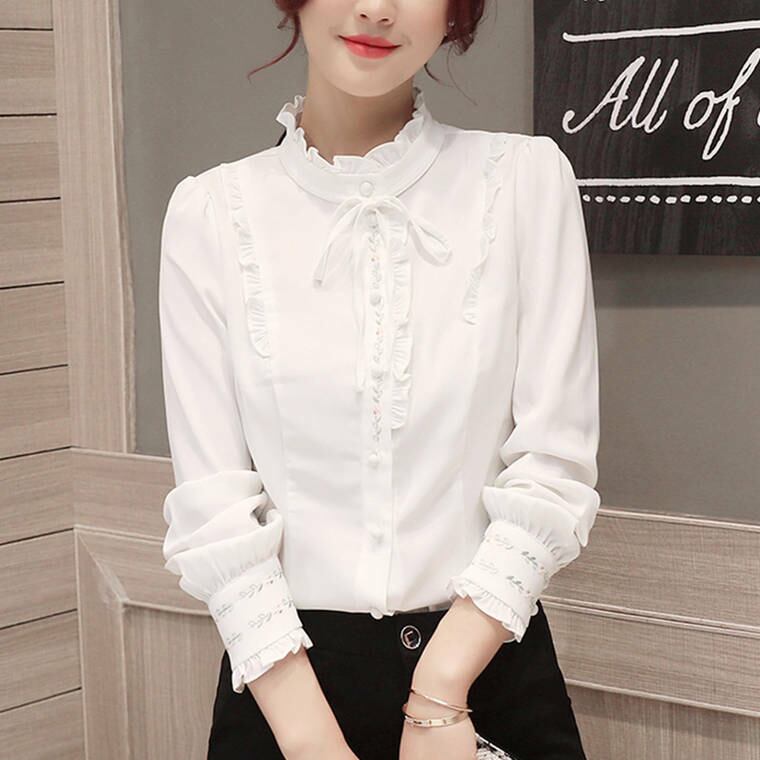春 夏 レディース ブラウス シャツ 大きいサイズ ワンカラー 清楚 シンプル フリル リボンタイ ボトルネック フリル襟 長袖 ワンポイント 葉っぱ オフィス OL 通勤 通学 YN-6-39 | dress_sugar_moon