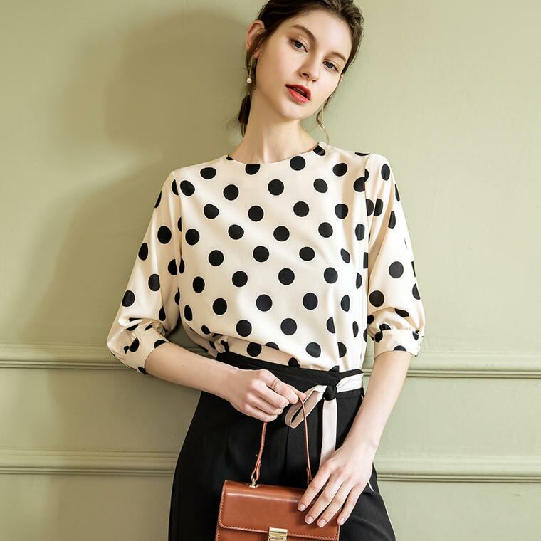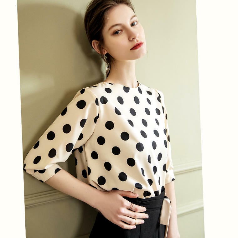 春 夏 レディース シャツ ブラウス 大きいサイズ トップス ドット柄 水玉 ラウンドネック 通勤 通学 学生 キャンパス オフィス お出かけ デート YN-6-59 | dress_sugar_moon