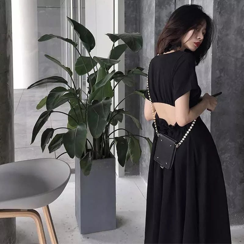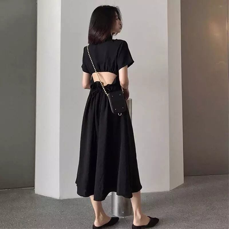 春 夏 レディース ワンピース 黒 ブラック ラウンドネック 膝丈 背中あき フリル セクシー キュート きれいめ 可愛い シンプル 大人 パーティー お呼ばれ デート 女子会 YN-6-98 | dress_sugar_moon