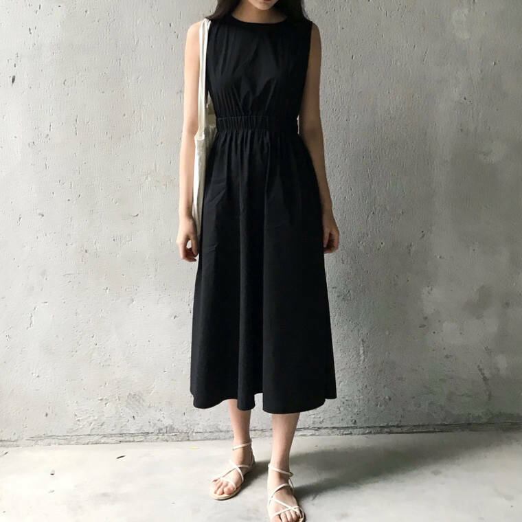 春 夏 レディース ワンピース ノースリーブ 袖なし ノースリーブワンピース 背中あき バックコンシャス おしゃれ 可愛い シンプル 2カラー 黒 黄 ミドル丈 デート YN-6-101 | dress_sugar_moon