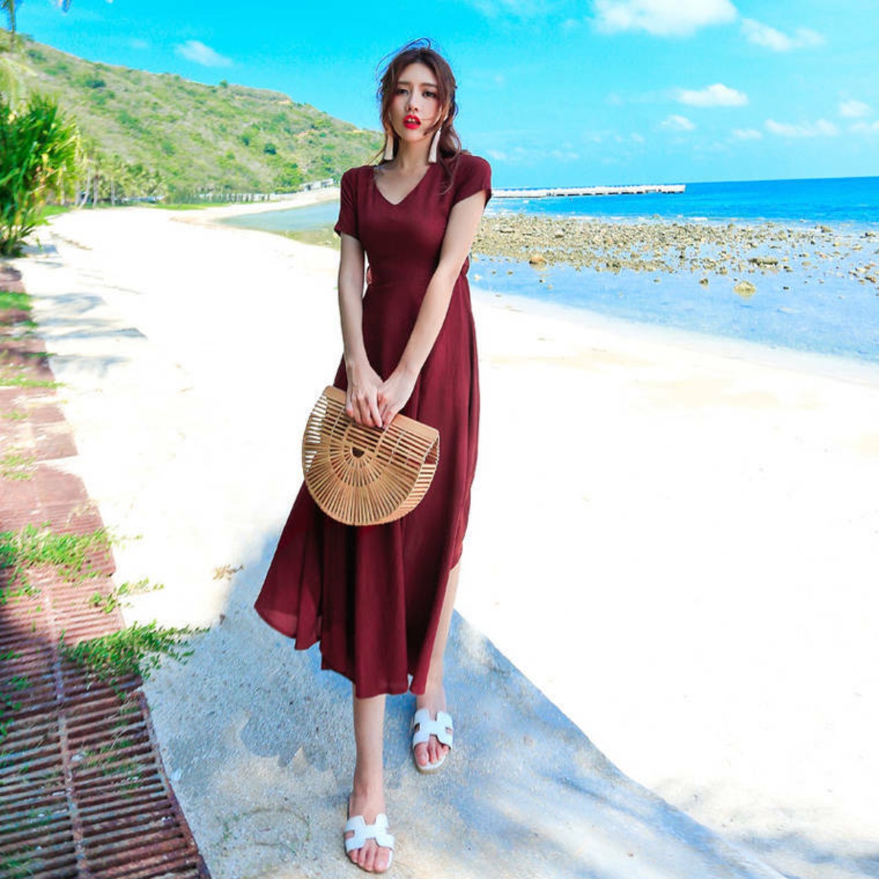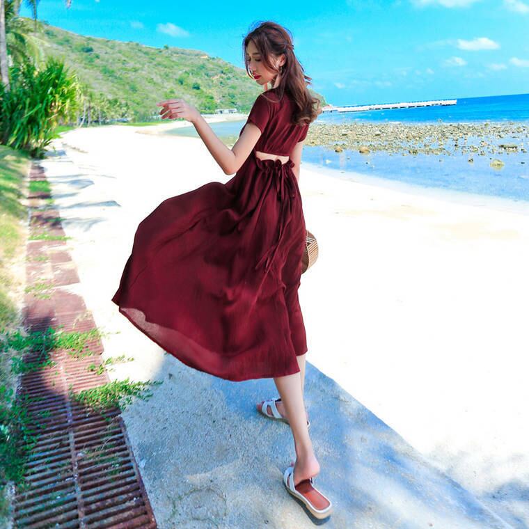 春 夏 レディース ワンピース 半袖 Vネック 背中あき フリル セクシー キュート 大人 可愛い 海 リゾート おしゃれ ワンカラー 赤 S M XL YN-6-106 | dress_sugar_moon