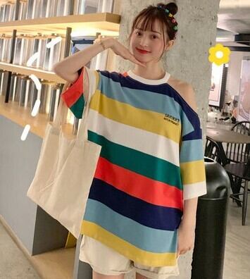 春 夏 レディース シャツ ブラウス 2色 肩見せ ワンオフショル リブニット オーバーサイズ ストライプ トップス かわいい 韓国トップス トップス 半袖 リゾート 海 プール おしゃれ かわいい 韓国 きれいめ プチプラ SY-6-342 | dress_sugar_moon