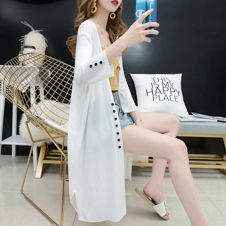 春 夏 レディース カーディガン 可愛い おしゃれ 上品 Vネック シンプル 紫外線予防 デート お出かけ 白 ベージュ 黒 ロング丈 ボタン 飾り YN-6-250 | dress_sugar_moon