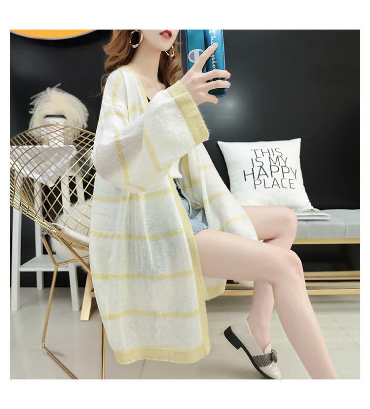 春 夏 レディース カーディガン 可愛い おしゃれ 上品 Vネック シンプル 紫外線予防 デート お出かけ 緑 青 黄 ロング丈 ボーダー 横縞 縞模様 しましま YN-6-251 | dress_sugar_moon
