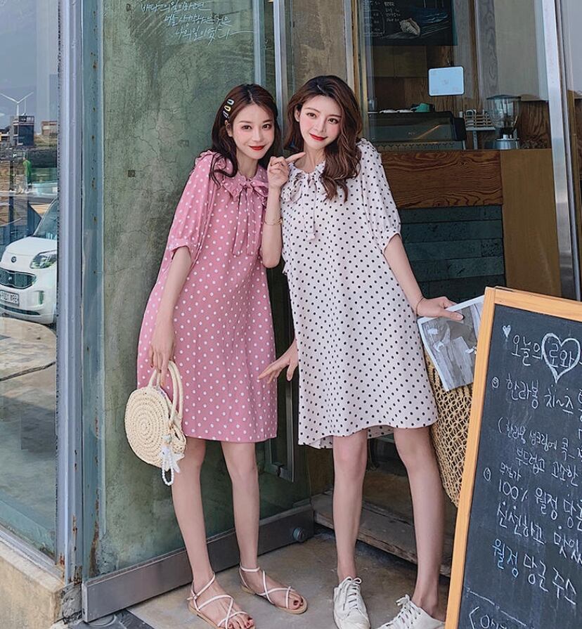 春 夏 レディース ワンピース ドット 水玉 ピンク ホワイト ハイウエスト ミニ丈 膝上 5分袖 おしゃれ 可愛い キュート 双子コーデ おそろい YN-7-13 | dress_sugar_moon