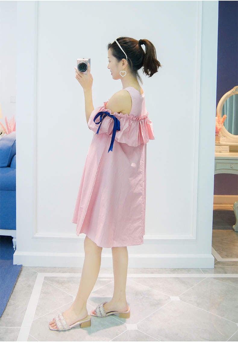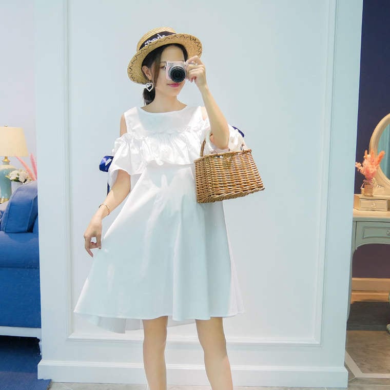 春 夏 レディース ワンピース チュニック トップス オフショルダー 肩出し ノースリーブ マタニティ ママ 妊婦 肩リボン ラウンドネック フリル シンプル 無地 可愛い 白 桃 黄 YN-7-27 | dress_sugar_moon