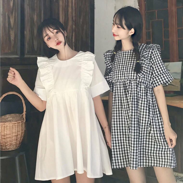 春 夏 レディース ワンピース チェック ホワイト 双子コーデ ミニ丈 膝上 原宿系 可愛い リボン バックリボン バックコンシャス フリル お揃い ペア YN-7-47 | dress_sugar_moon