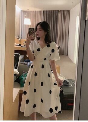 春 夏 レディース ワンピース ホワイト 白 水玉 ドット柄 半袖 Vネック 背中見せ ロング丈 ロングワンピース リゾート 海 プール おしゃれ かわいい 韓国 きれいめ プチプラ SY-7-133 | dress_sugar_moon