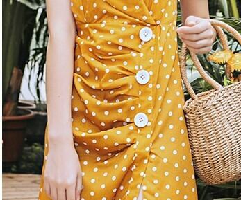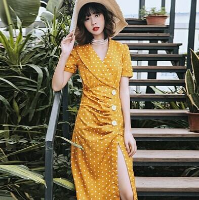 夏 秋 レディース ワンピース イエロー 黄 ドット柄 Ⅴネック 半袖 スリット ロング丈 ロングワンピース おしゃれ かわいい 韓国 きれいめ プチプラ SY-8-52 | dress_sugar_moon