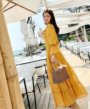 夏 秋 レディース ワンピース 大きいサイズ イエロー 黄 長袖 ロング丈 フリル ロングワンピース フリルワンピース おしゃれ かわいい 韓国 きれいめ プチプラ SY-8-116 | dress_sugar_moon