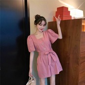 春 夏 レディース オールインワン ジャンプスーツ ゆったり スクエアネック パフスリーブ ミニ丈 ショートパンツ ロンパース サロペット くすみカラー 黒 桃 2カラー YN-8-106 | dress_sugar_moon