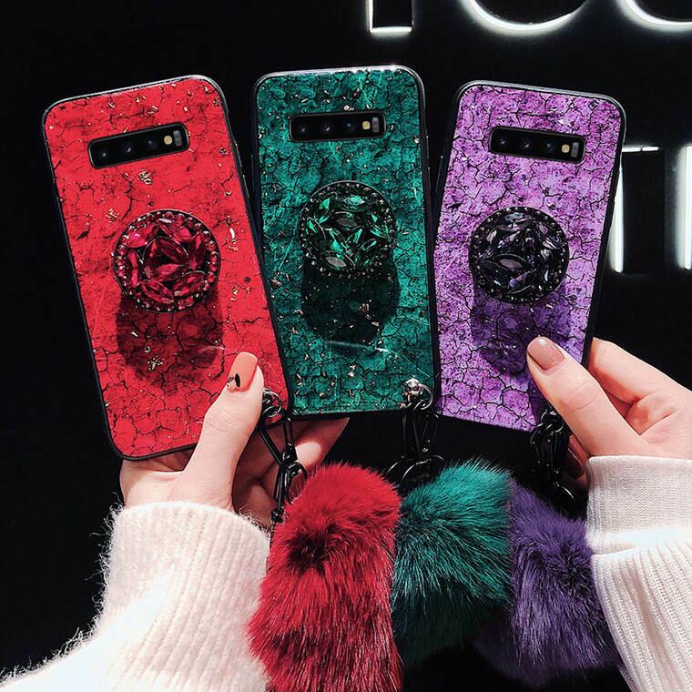 Galaxy ケース カバー スマホケース Android キラキラ 高級感 ボンボン 落下防止 キーホルダー 赤 紫 緑 S10 S10+ S10e シンプル おしゃれ YN-8-92