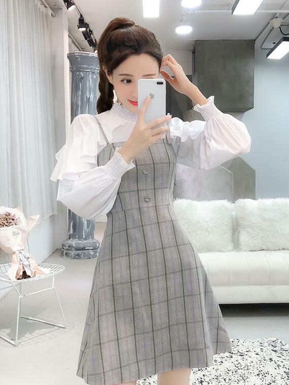 春 秋 レディース ワンピース セットアップ ツーピース ブラウス ワンピース チェック 格子 フリルブラウス シャツ ミニ丈 長袖 おしゃれ 原宿系 学生 キャンバス YN-8-243 | dress_sugar_moon