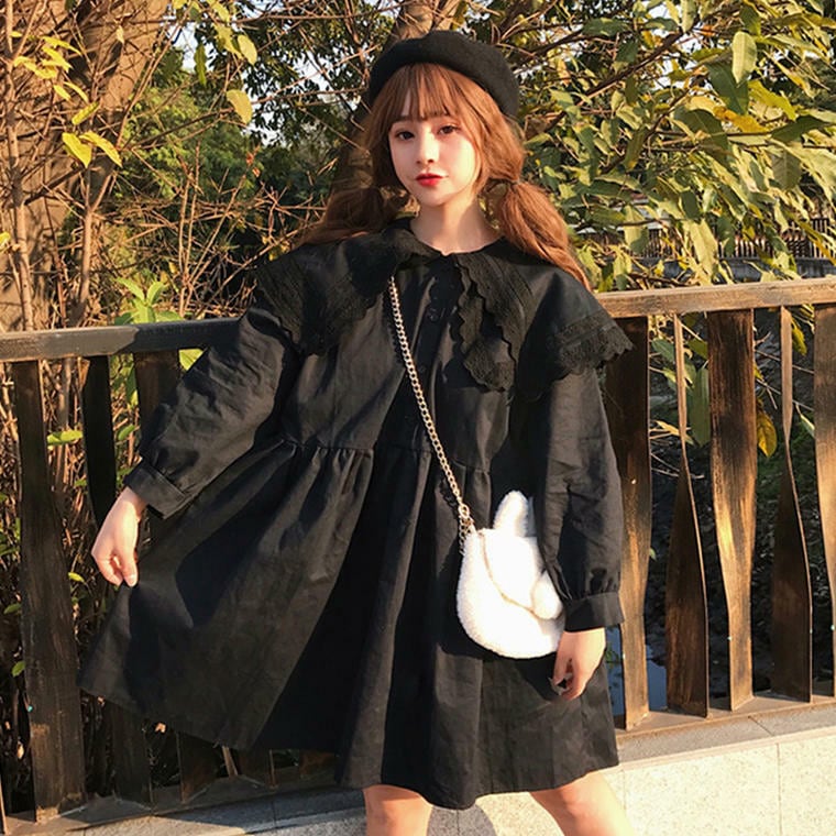 春 秋 冬 レディース ワンピース 長袖 ドールカラー ダブルカラー 白 黒 ゴスロリ ゴシック ロリータ ふんわり ワンサイズ 膝上 ミニ丈 シンプル 可愛い 原宿系 双子コーデ YN-9-29