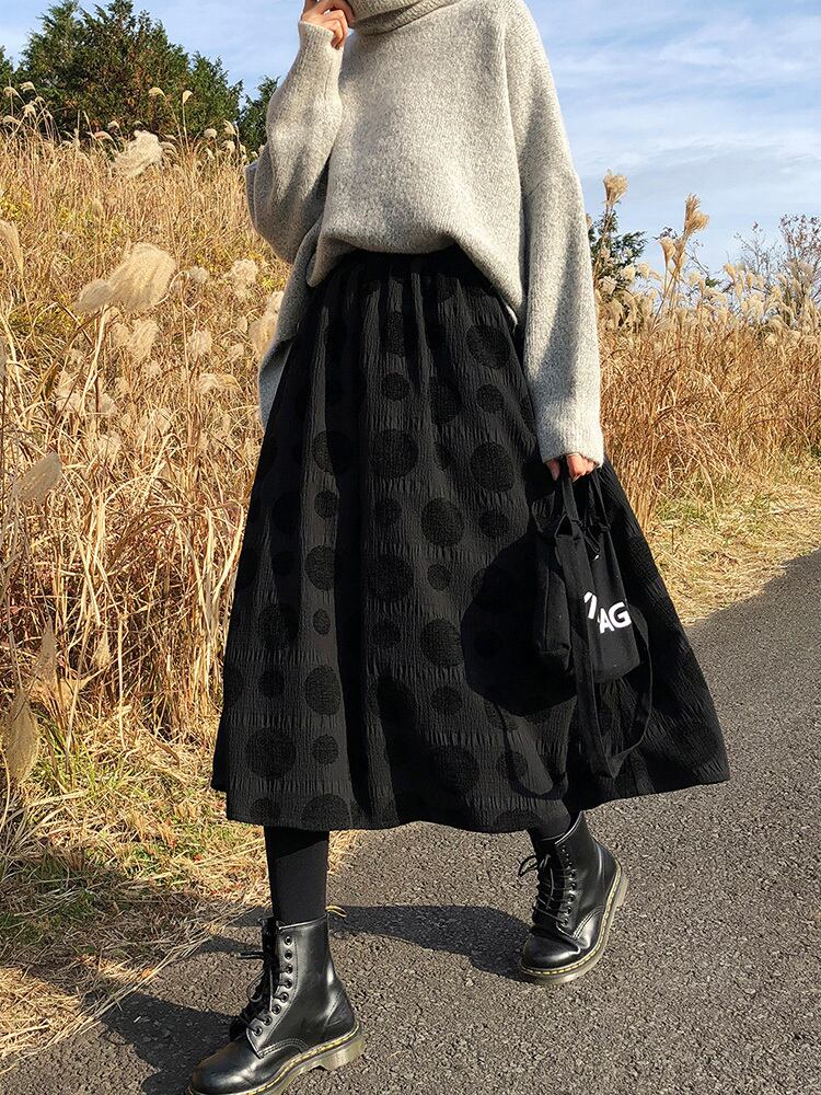 秋 冬 レディース スカート ボトムス ロングスカート ブラック 黒 ドット柄 レトロ ハイウエスト かわいい おしゃれ 韓国 きれいめ プチプラ FA-9-84 | dress_sugar_moon